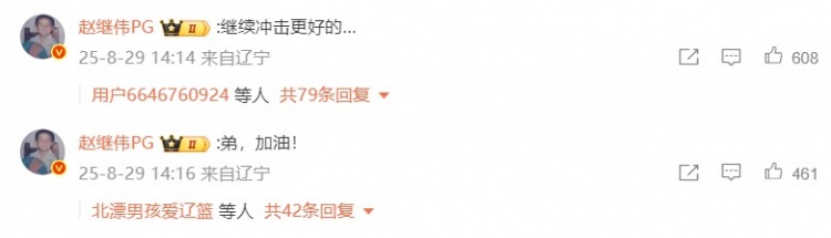 在这条微博的评论区,赵继伟写下了两条鼓励,先是写道:“继续冲击更好的……”之后又写道:“弟,加油!”