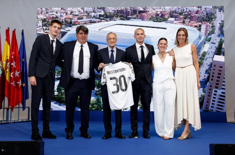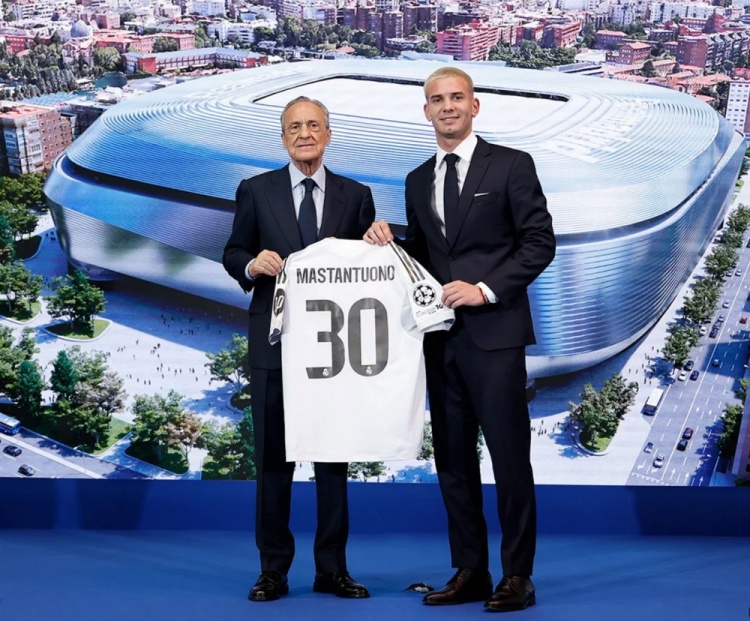 “亲爱的马斯坦托诺,今天你加入了那些来到皇家马德里的著名阿根廷球员行列。你的同胞们的才华和性格多次出现在我们俱乐部的重大胜利中。从现在起,伯纳乌球场将为你提供一切支持,直到最后。你将与那些赢得了一切并且首先是皇马球迷的球员们共享更衣室。从今天起,你将穿上代表15座欧洲冠军杯荣誉的白色球衣,在皇家马德里开启你的故事。”