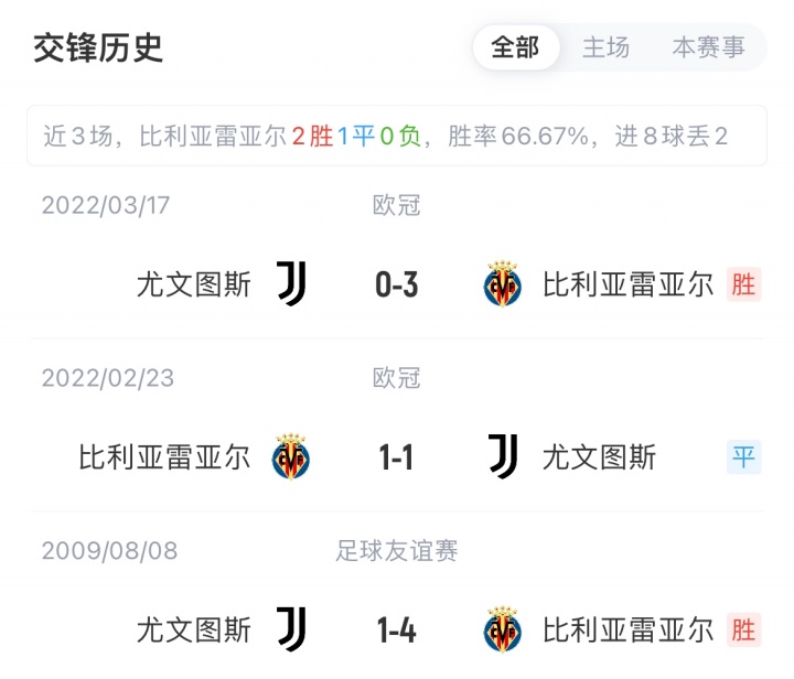 尤文欧冠2次对阵比利亚雷亚尔均不胜(1平1负)。